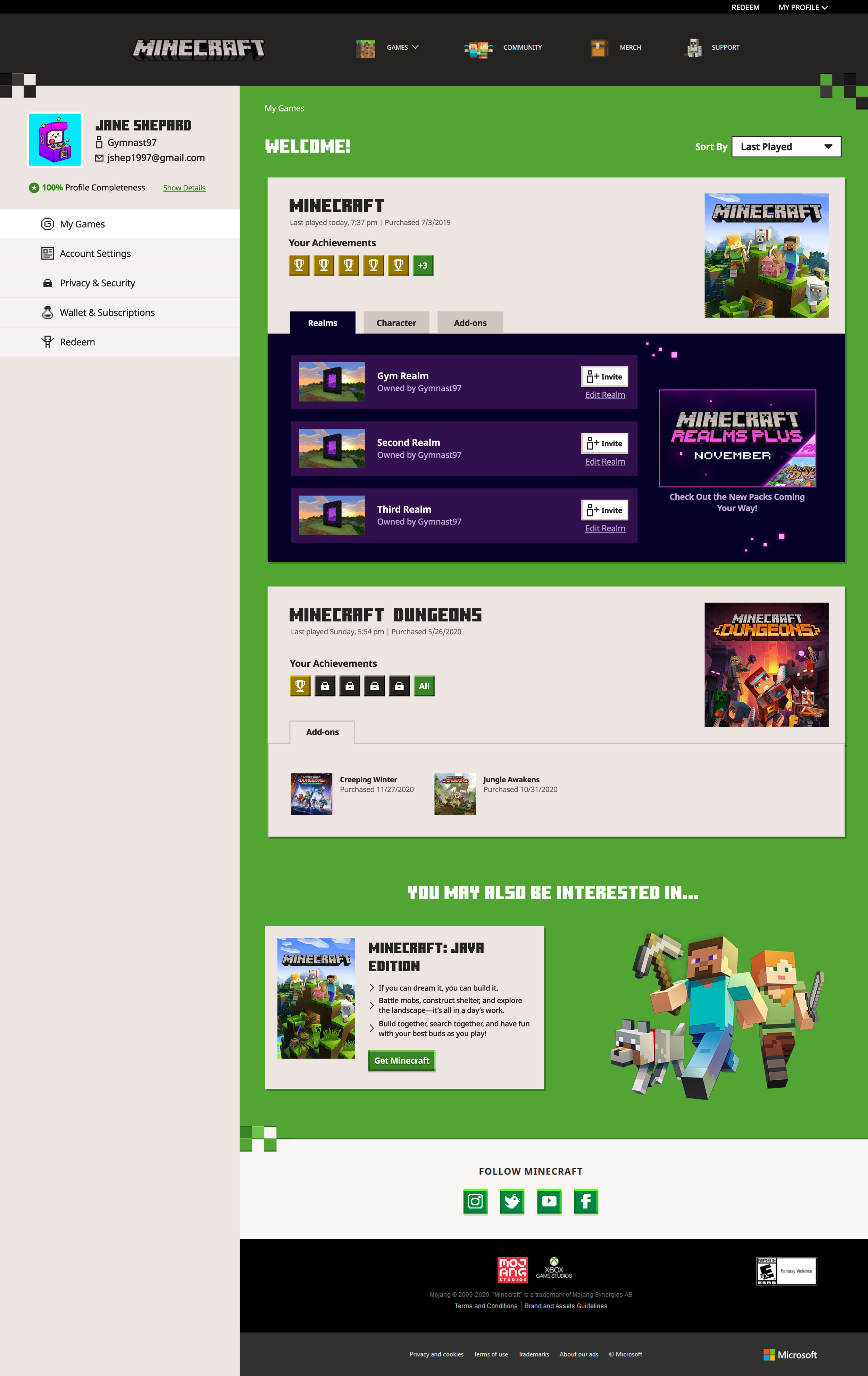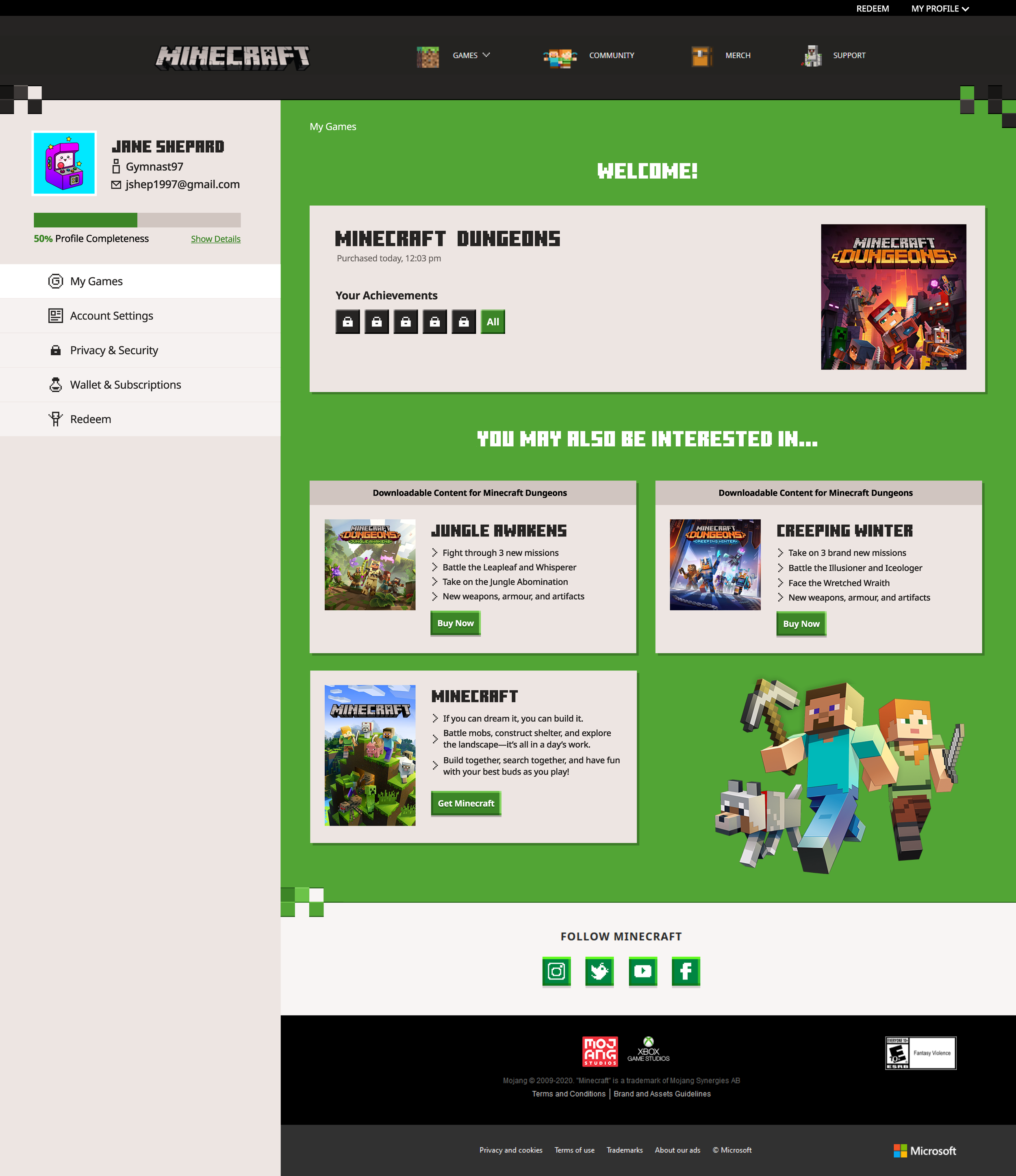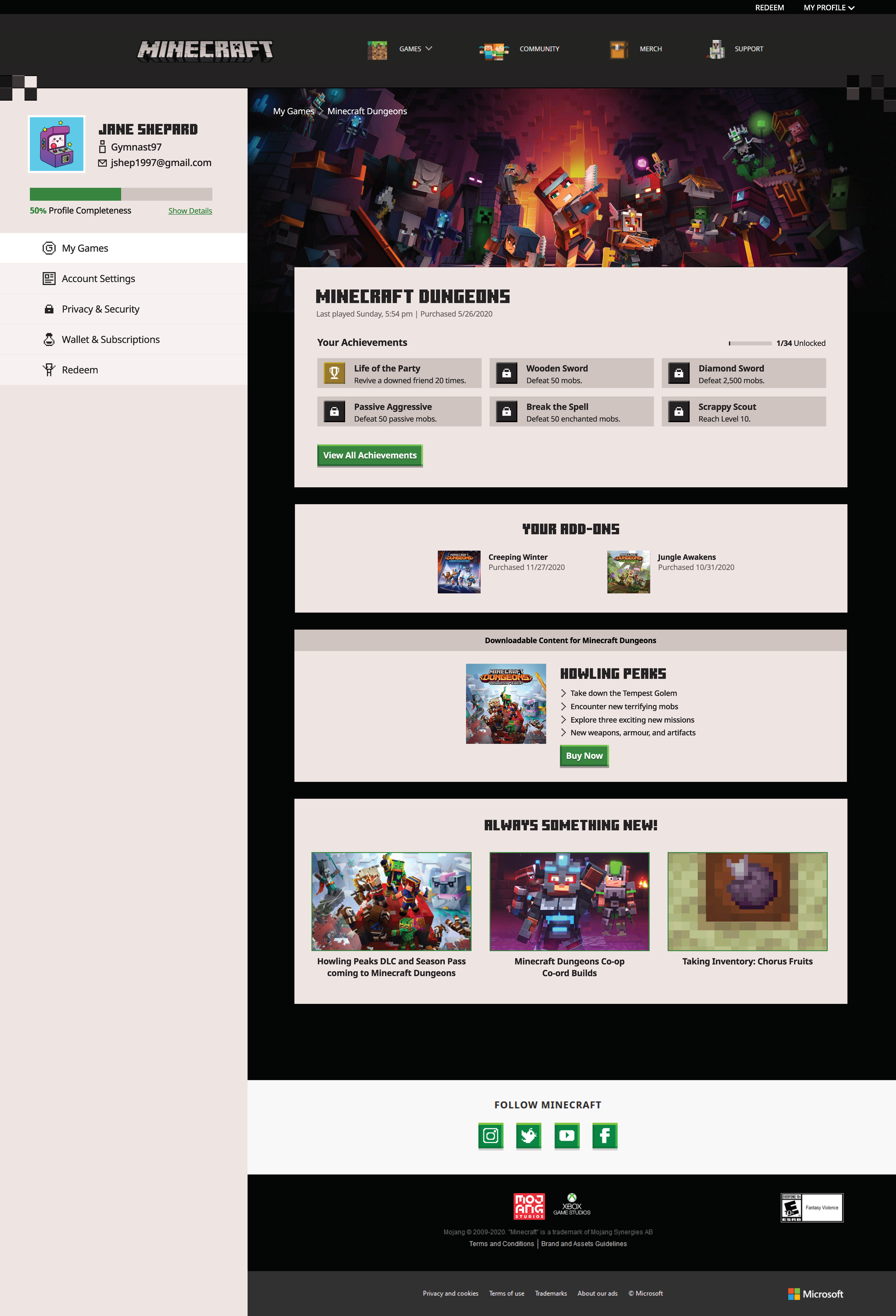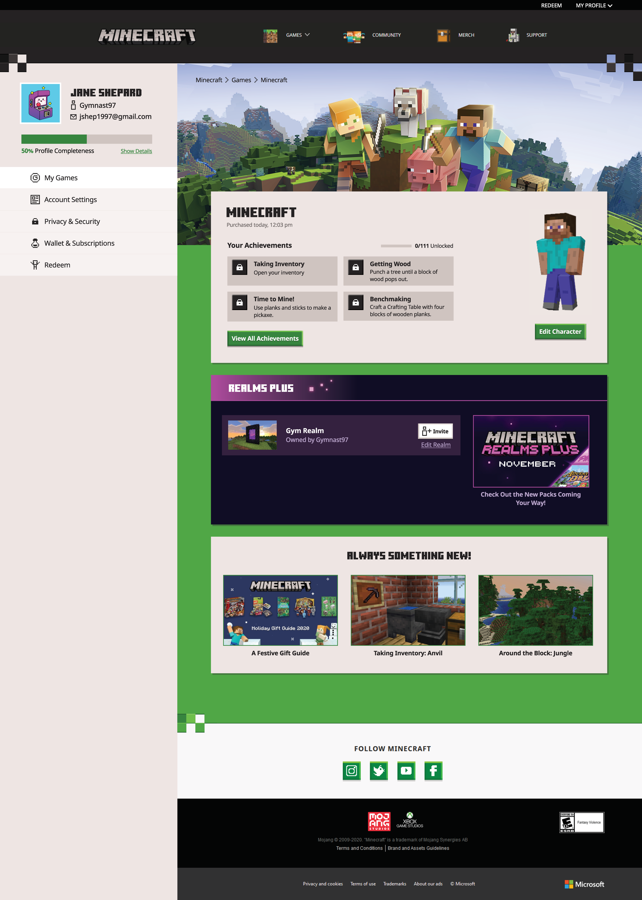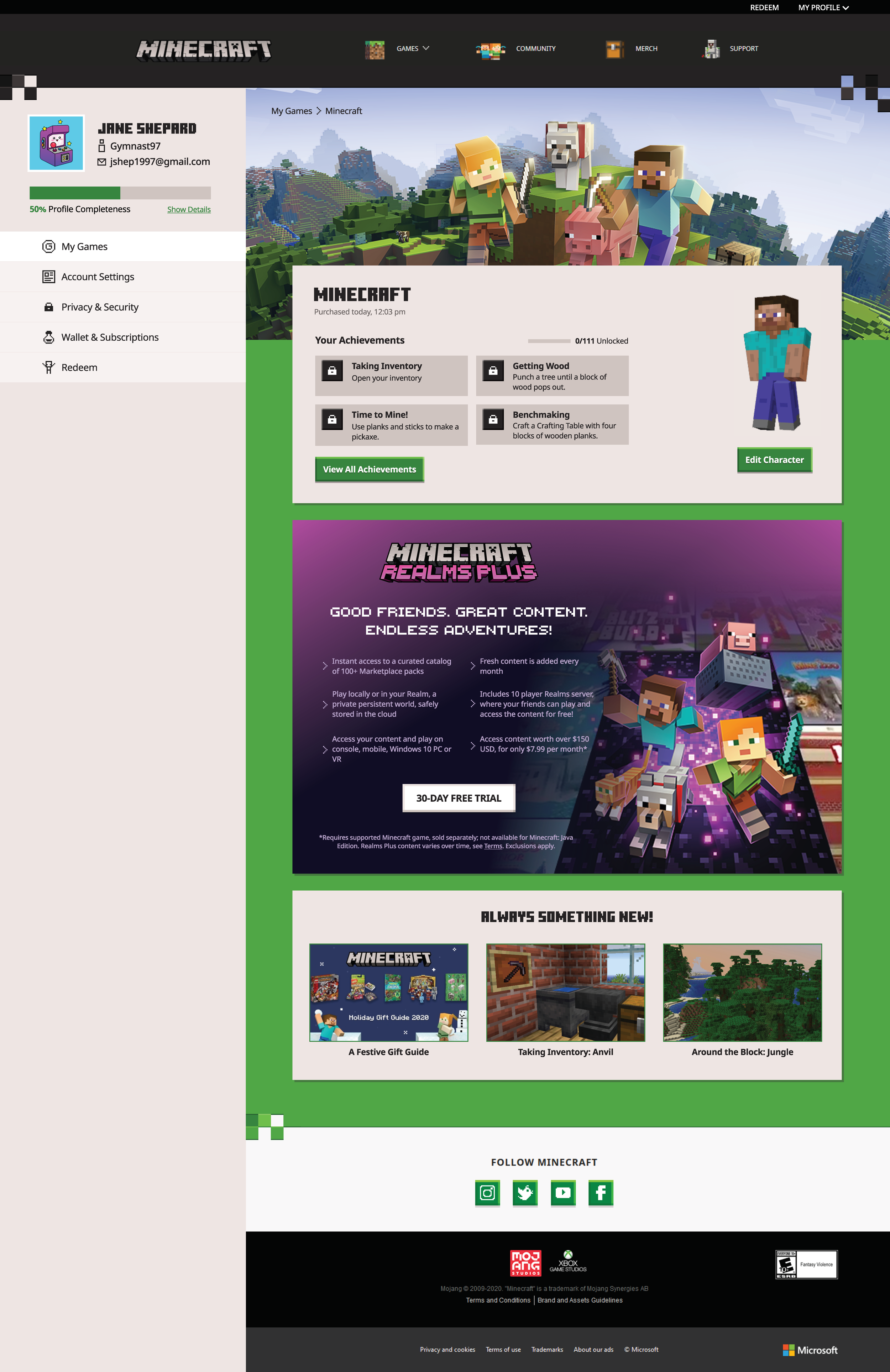 Directed the designs for an update to the Minecraft Account Experience on web and mobile. Players can manage their profile, view achievements, redeem game codes, manage realms, etc.