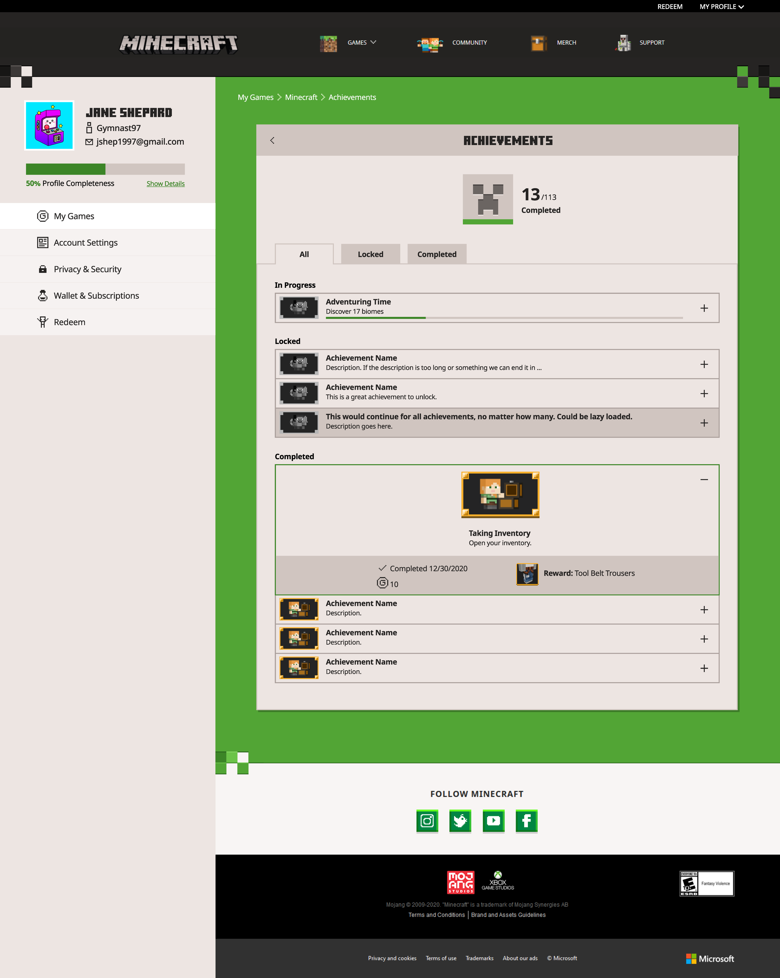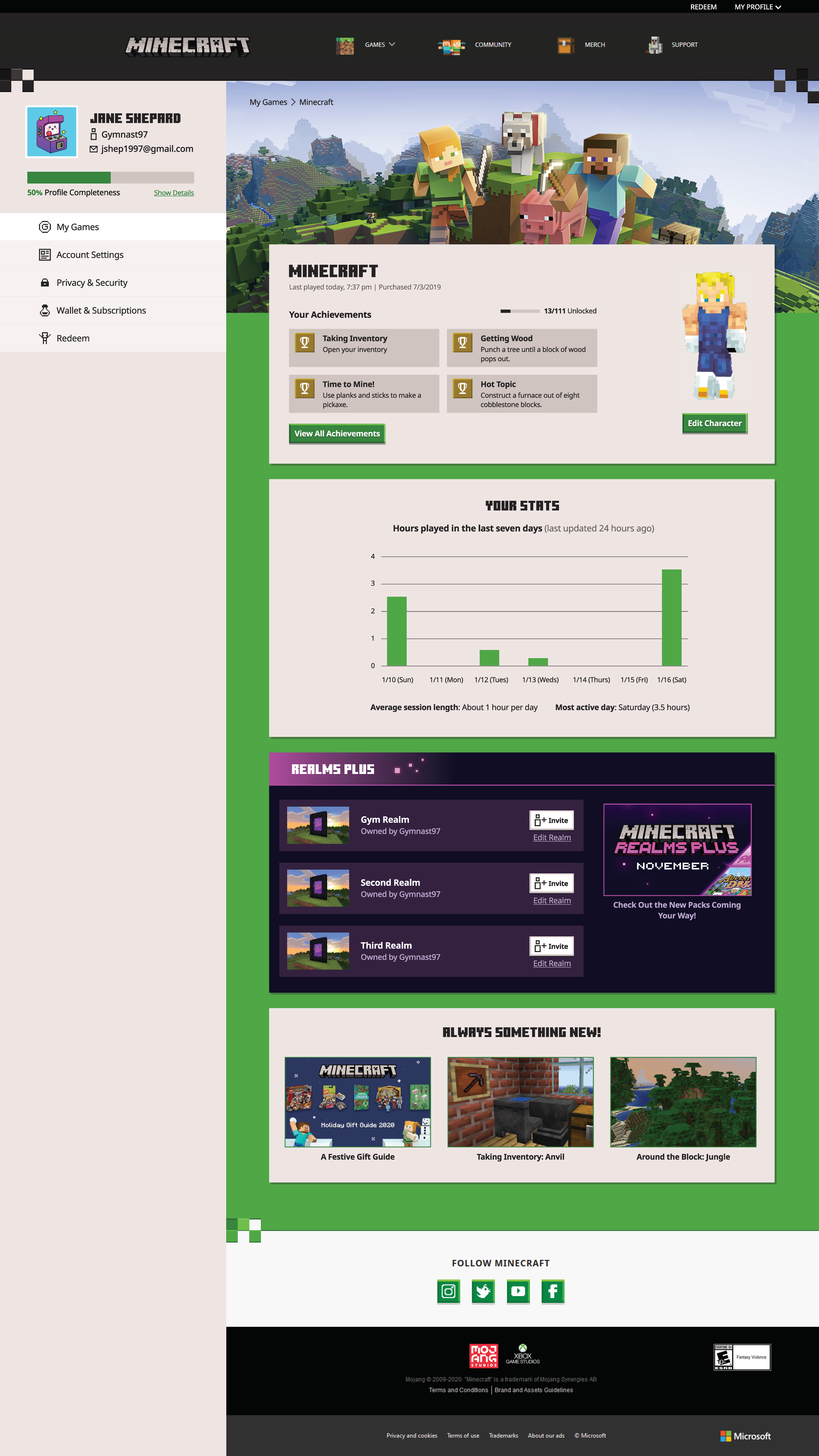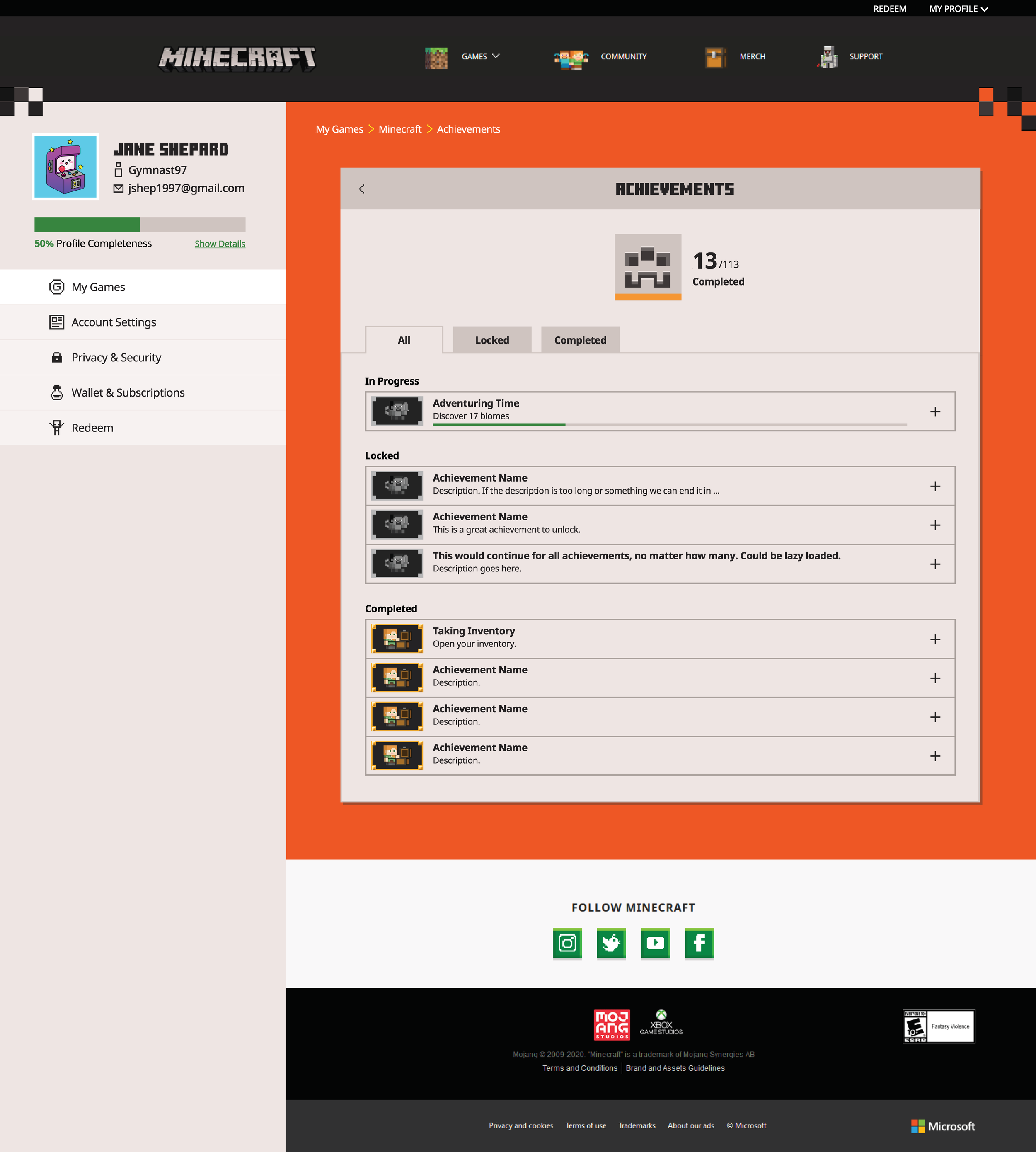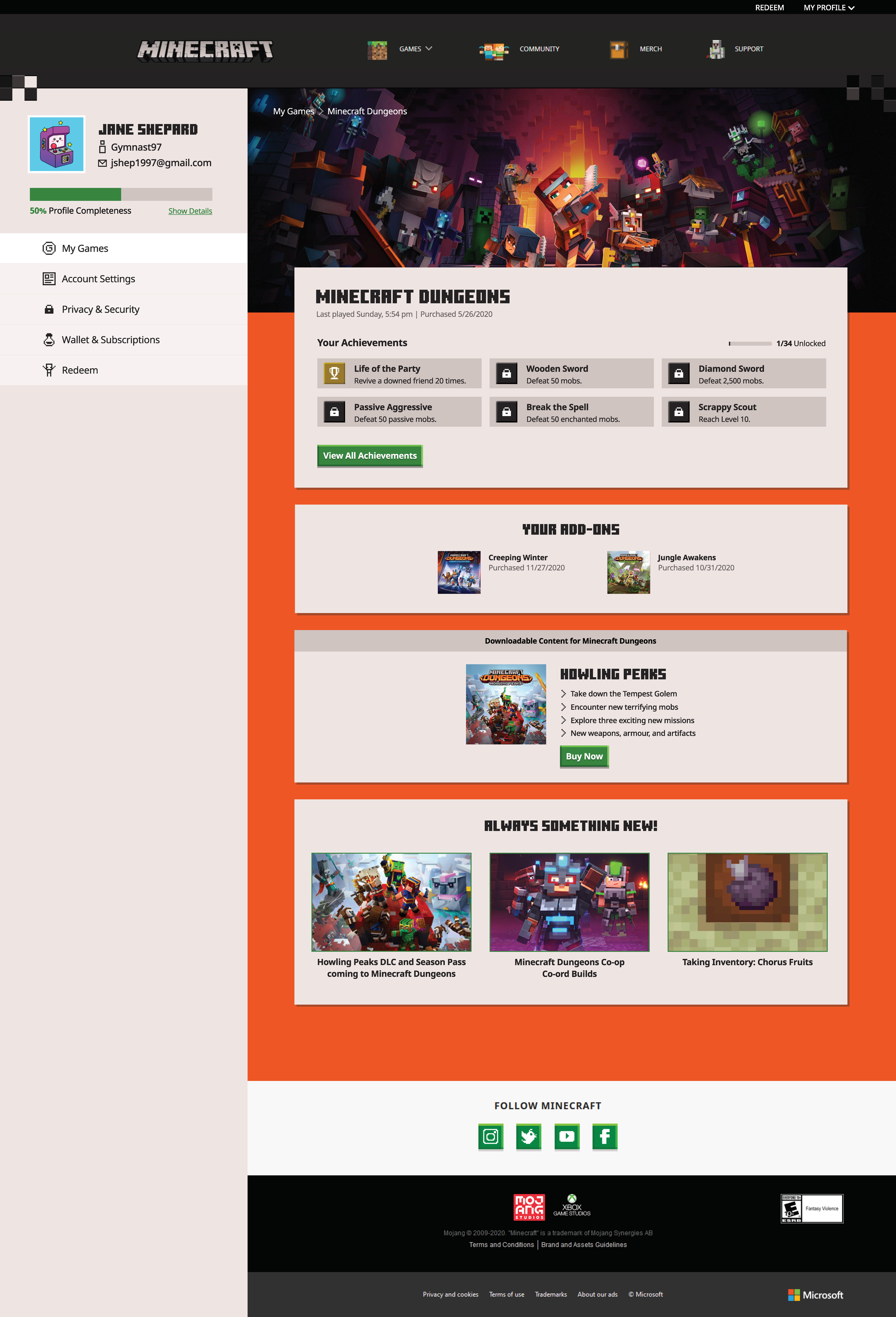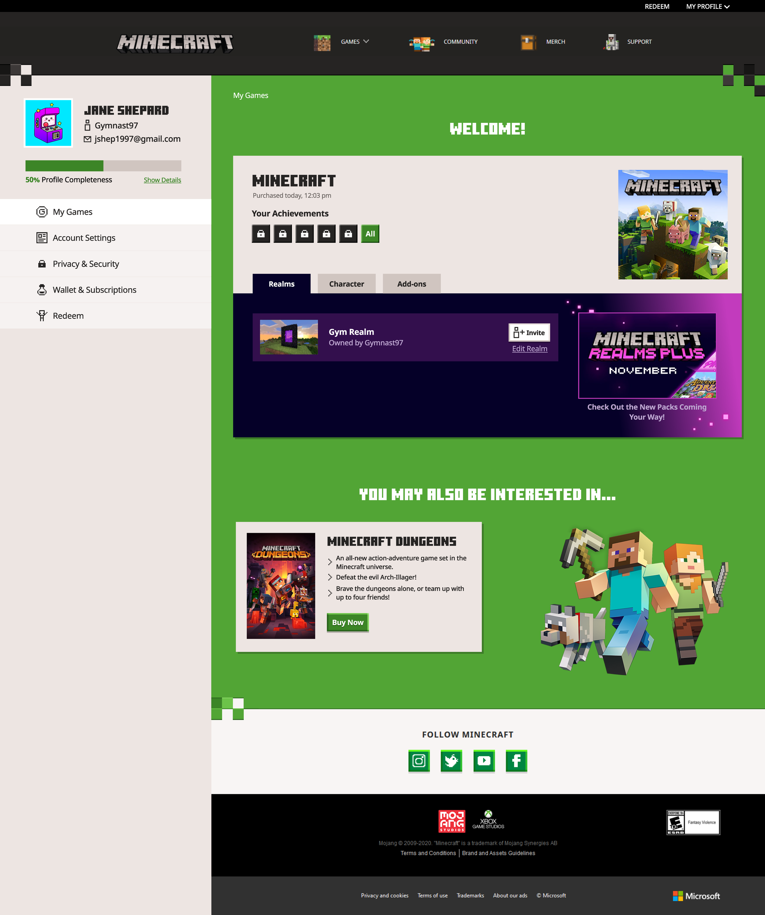 Directed the designs for an update to the Minecraft Account Experience on web and mobile. Players can manage their profile, view achievements, redeem game codes, manage realms, etc.