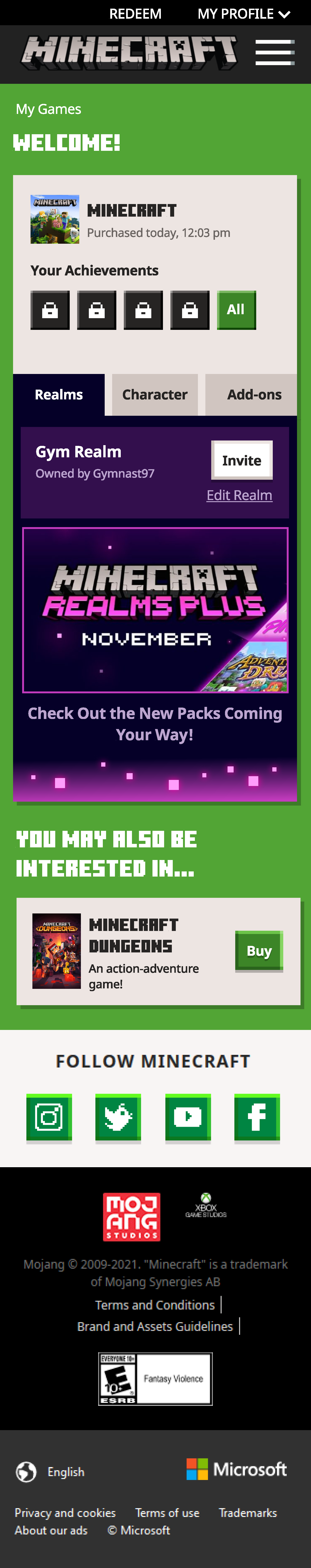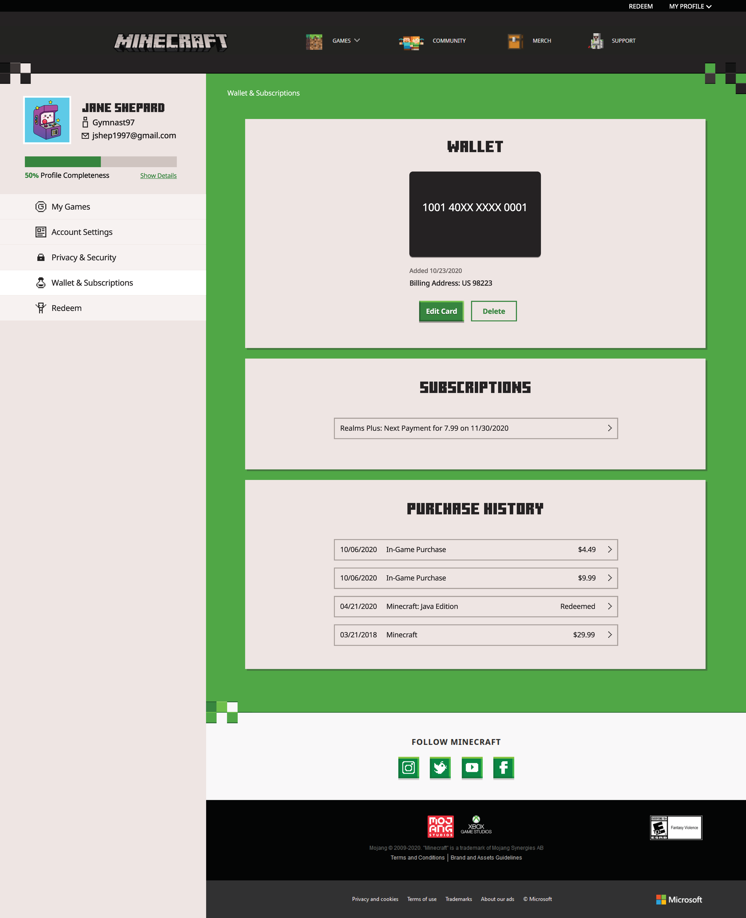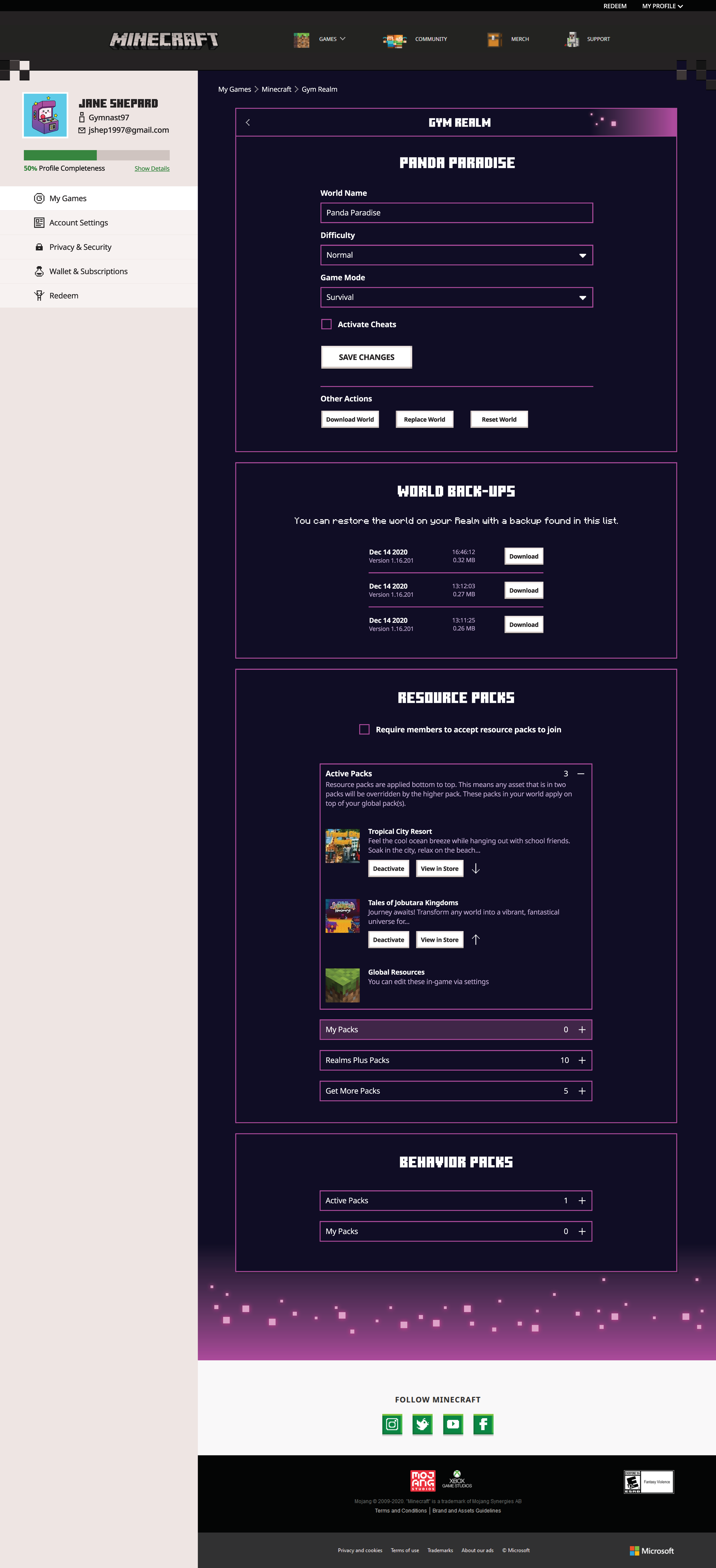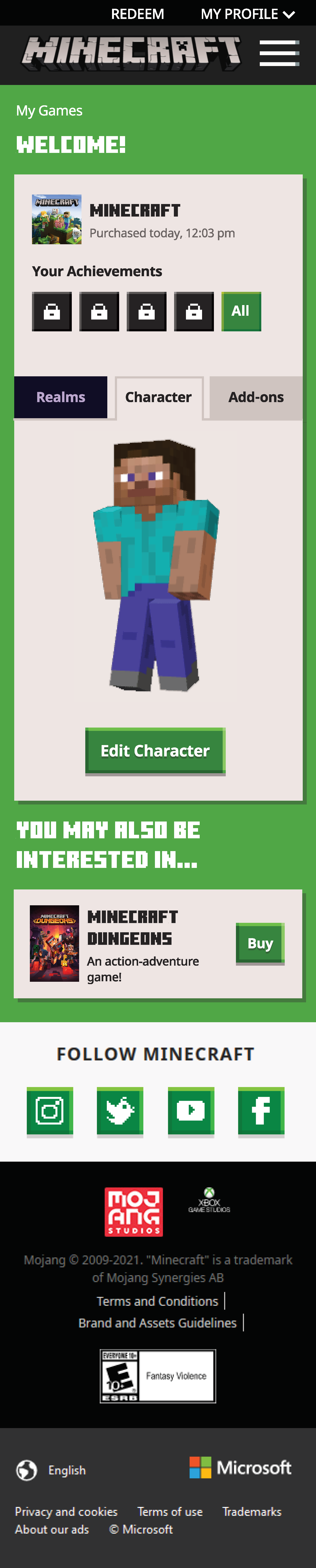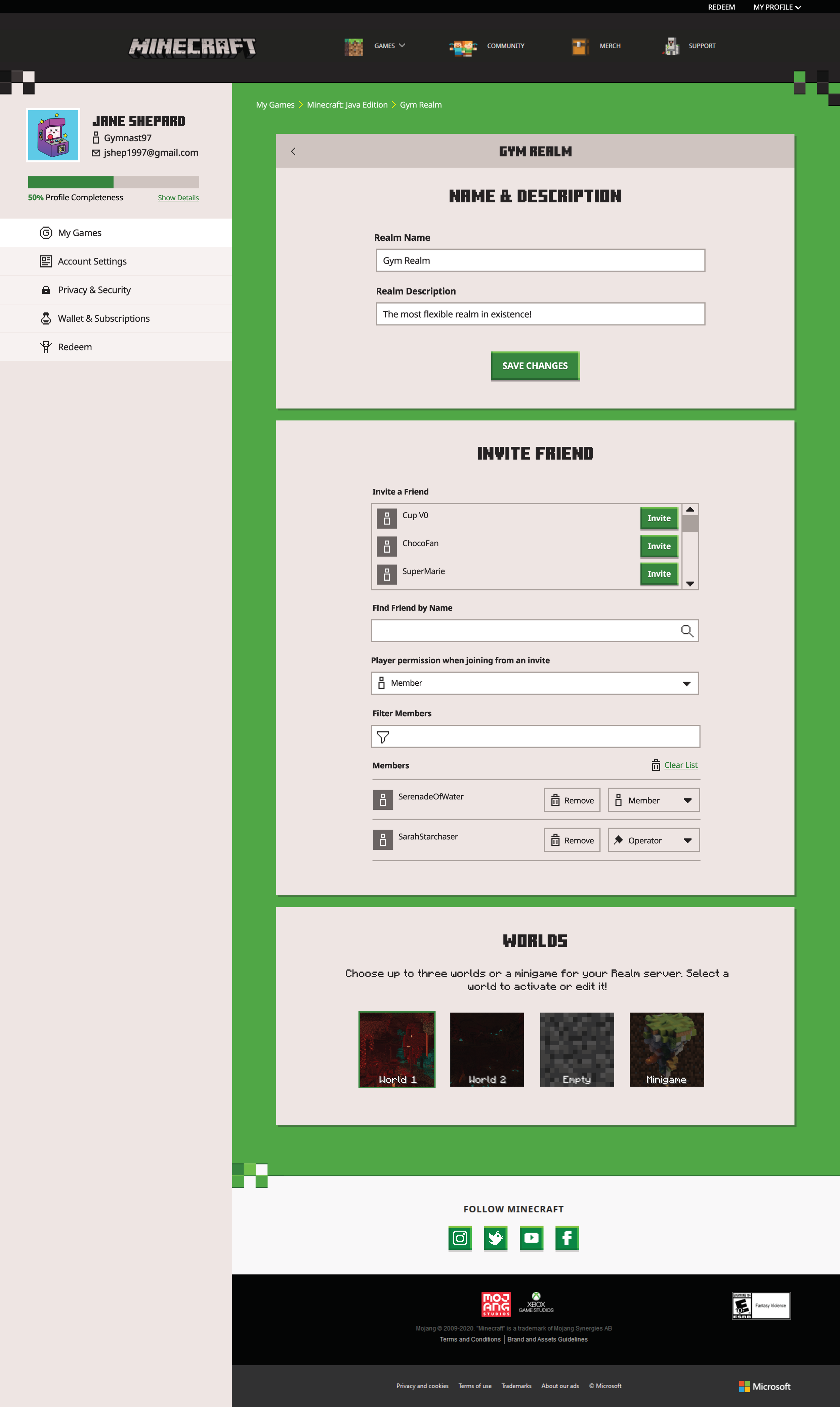 Directed the designs for an update to the Minecraft Account Experience on web and mobile. Players can manage their profile, view achievements, redeem game codes, manage realms, etc.
